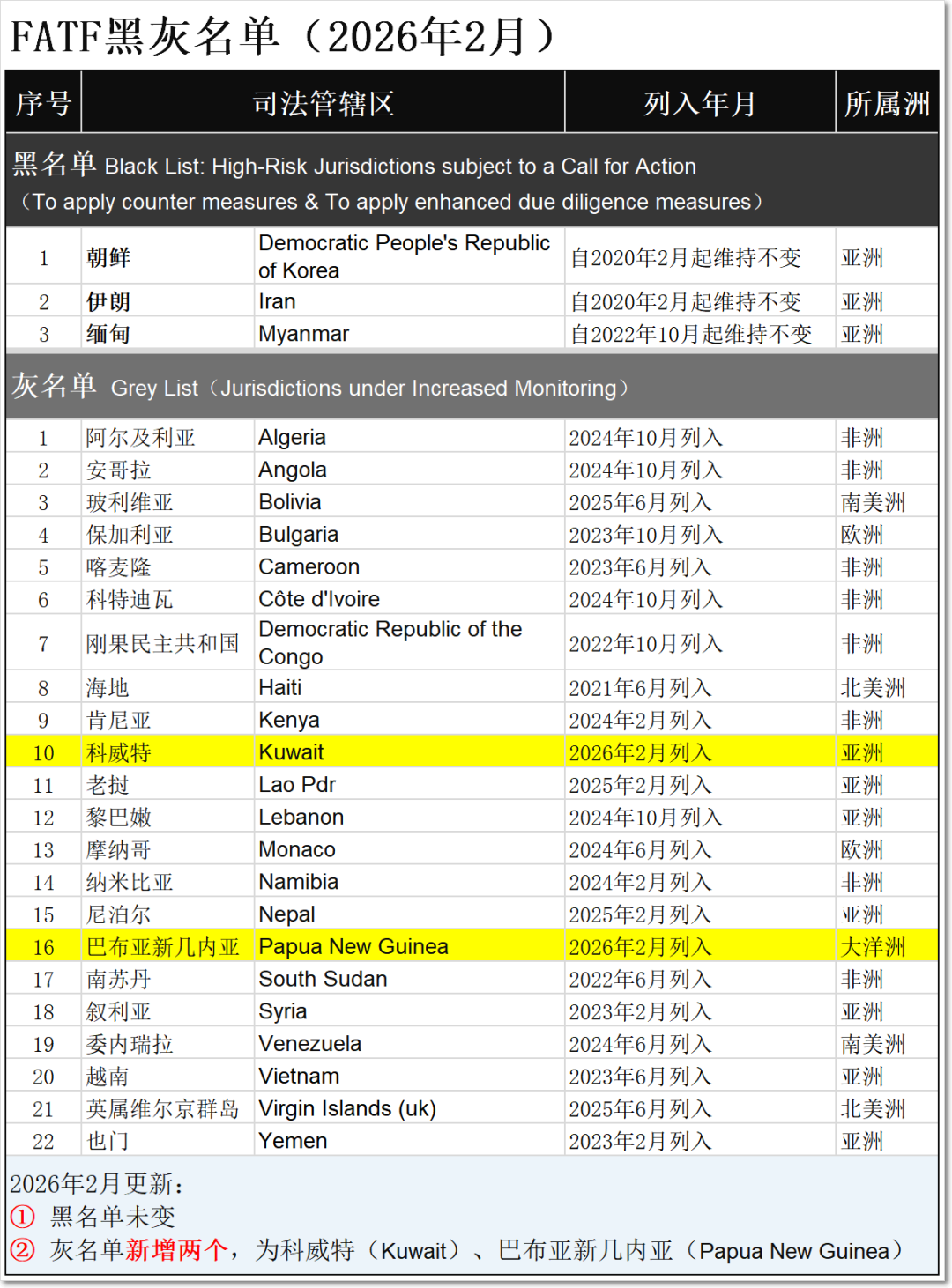 · 灰名單增加兩個(gè)國(guó)家,分別為科威特(Kuwait)、巴布亞新幾內(nèi)亞(Papua New Guinea)。