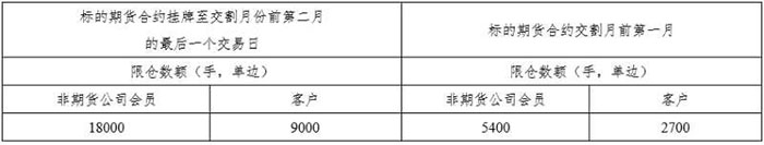 非期貨公司會(huì)員和客戶持有的某月份期權(quán)合約所有看漲期權(quán)的買持倉(cāng)量和看跌期權(quán)的賣持倉(cāng)量之和、看跌期權(quán)的買持倉(cāng)量和看漲期權(quán)的賣持倉(cāng)量之和,分別不得超過(guò)下表所示的持倉(cāng)限額。