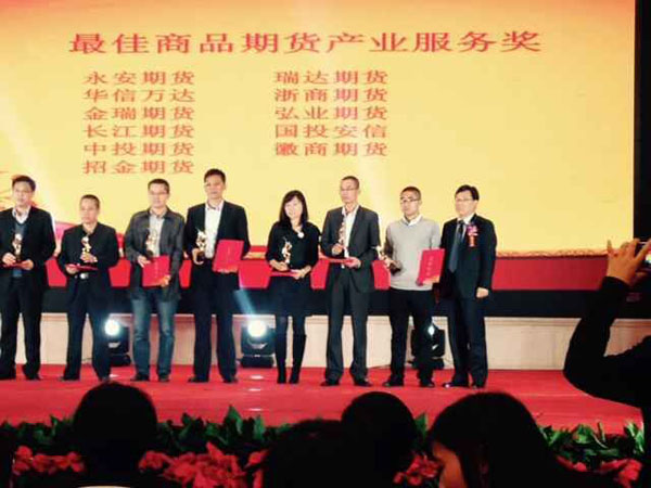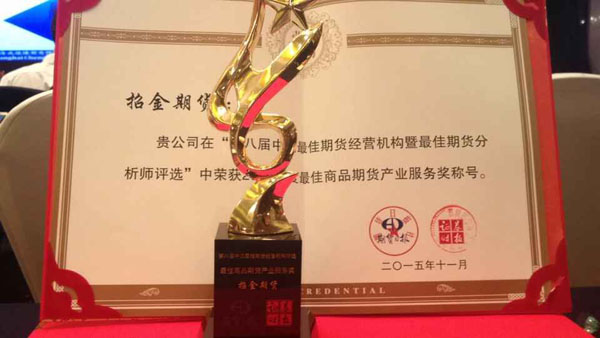 2015年11月13日,在由《證券時報》、《期貨日報》聯(lián)合主辦的“第八屆中國最佳期貨經(jīng)營機(jī)構(gòu)暨最佳期貨分析師評選”中,招金期貨榮獲“中國最具成長性期貨公司”、“最佳資產(chǎn)管理業(yè)務(wù)獎”、“最佳商品期貨產(chǎn)業(yè)服務(wù)獎”、“中國期貨優(yōu)秀營業(yè)部-招金期貨有限公司臨沂營業(yè)部”稱號,同時招金期貨分析師李曉杰、袁帥榮獲“最佳工業(yè)品期貨分析師”,這是業(yè)界對招金期貨近幾年快速發(fā)展的高度褒獎。 據(jù)悉,"中國最佳期貨經(jīng)營機(jī)構(gòu)暨最佳期貨分析師評選"已成功舉辦八屆,是國內(nèi)設(shè)立最早、行業(yè)中最權(quán)威和最具影響力的評選活動.
