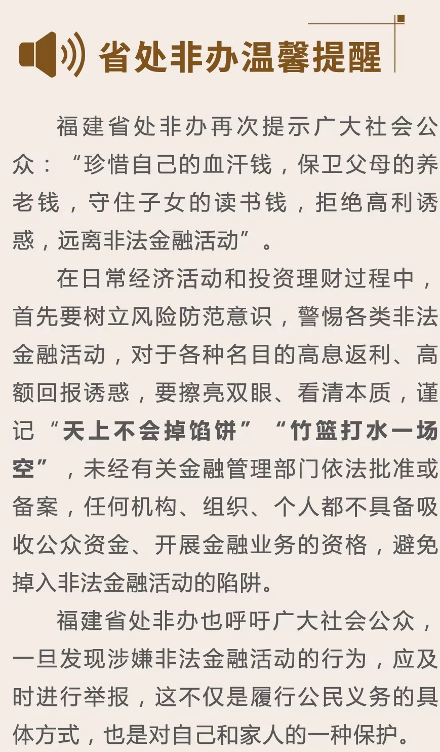 在非法集資監(jiān)測和排查過程中,福建省各級處非辦發(fā)現(xiàn)一些不法分子,利用各類非法金融平臺,打著“一帶一路”“支持三農(nóng)”“金融創(chuàng)新”“區(qū)塊鏈”等旗號,通過編造“高收益、低風(fēng)險”項目,發(fā)行“虛擬貨幣”“虛擬資產(chǎn)”“數(shù)字資產(chǎn)”等方式非法吸收公眾資金,侵害公眾合法權(quán)益。