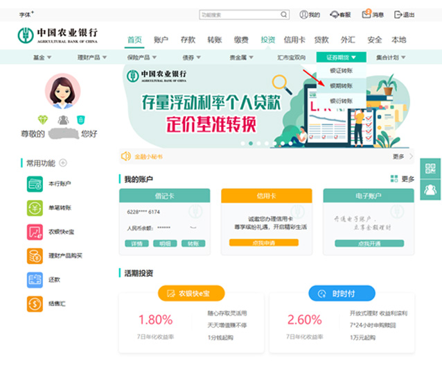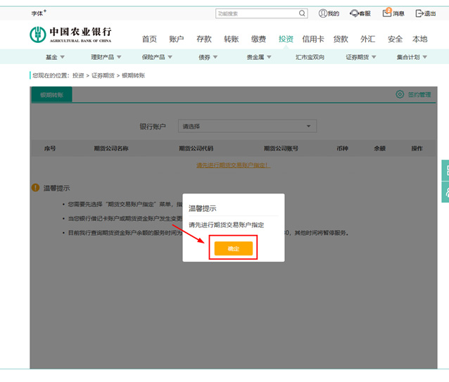 選擇“投資“-”證券期貨“-”銀期轉(zhuǎn)賬“。