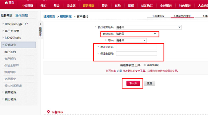 選擇期貨公司,輸入保證金賬號,填寫保證金密碼后點擊下一步。