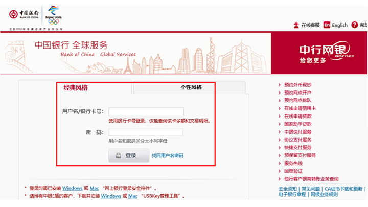 進入網(wǎng)頁版中國銀行官網(wǎng),點擊個人客戶網(wǎng)銀登錄→安裝網(wǎng)上銀行登錄安全控件→輸入用戶名和密碼登錄(輸入銀行卡號登錄,只能查詢余額和交易明細)。