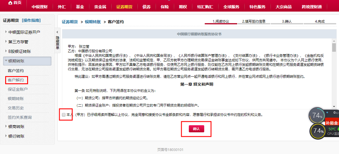點擊證券期貨→銀期轉賬→客戶解約,勾選“本人已閱讀”,點擊“確認”。