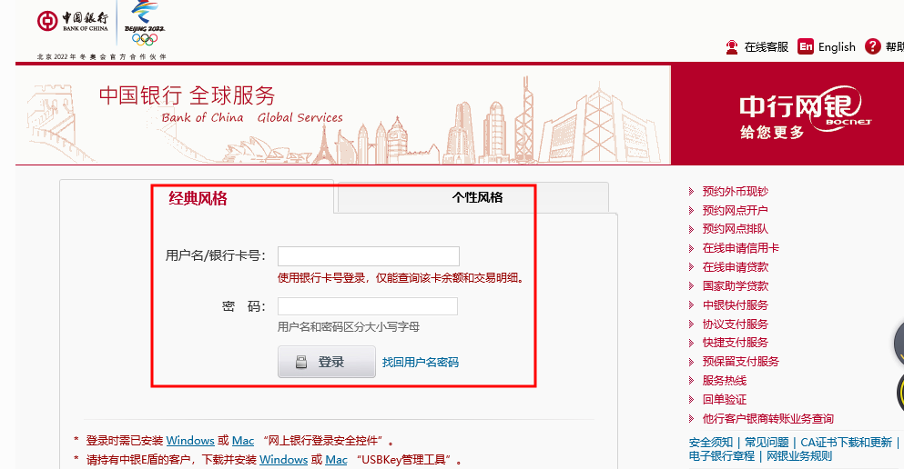 進入網(wǎng)頁版中國銀行官網(wǎng),點擊個人客戶網(wǎng)銀登錄→安裝網(wǎng)上銀行登錄安全控件→輸入用戶名和密碼登錄(輸入銀行卡號登錄,只能查詢余額和交易明細)。