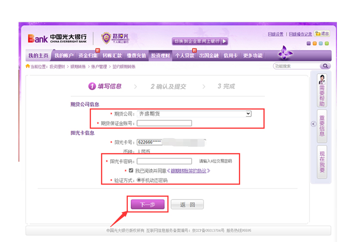 選擇期貨公司,輸入保證金照號,輸入銀行交易密碼,勾選“我已閱讀“,然后點擊下一步。