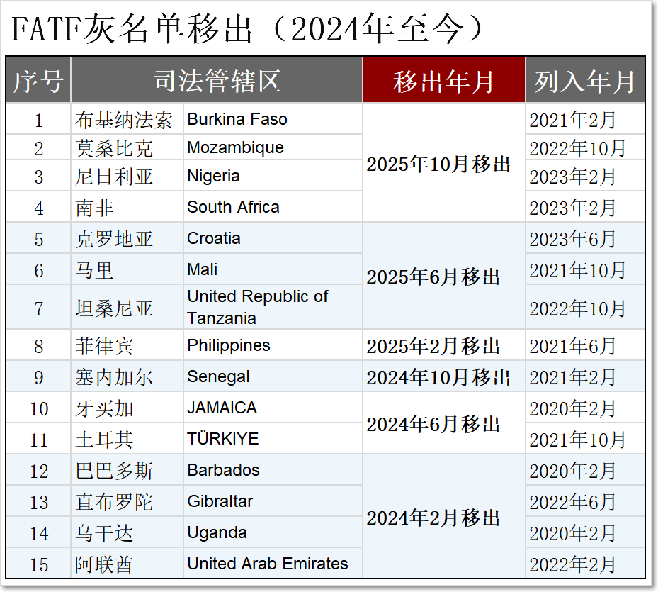 2024年至今,FATF灰名單共計(jì)移出15個(gè)國(guó)家,列入14個(gè)國(guó)家。