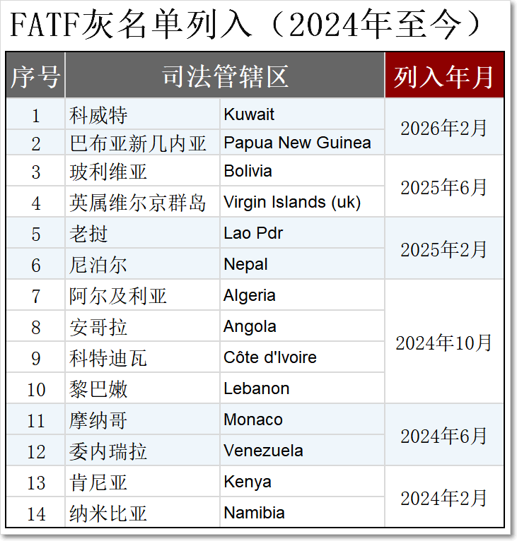 2026年2月13日,國(guó)際反洗錢反恐怖融資權(quán)威組織FATF(Financial Action Task Force on Money Laundering,金融行動(dòng)特別工作組)通過官網(wǎng)公布最新一期名單。其中: