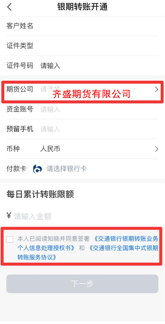 選擇期貨公司、輸入資金賬號(hào)等信息,勾選“本人已閱讀“。